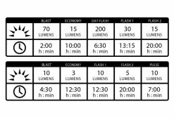 - Puissance (lumens): élevée (500), moyenne (250), faible (125), impulsion (125)