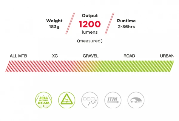 - Road Specif Beam : S’inspirant de la technologie des phares de voiture, les doubles lentilles permettent un faisceau optimal pour le cyclisme sur route avec un faisceau plat pour la périphérie et un faisceau ponctuel éclairant la voie à suivre, qui peut être incliné pour le trafic venant en sens inverse avec l’interrupteur filaire monté sur le guidon inclus.