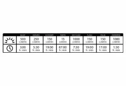 - 7 modes d’éclairage : Eco » (300 Lumen), « Standard » (600 Lumen), « Power » (1300 Lumen) et « High Power » (2000 Lumen) avec trois modes de clignotement « Flash », « Pulse » et « SOS »