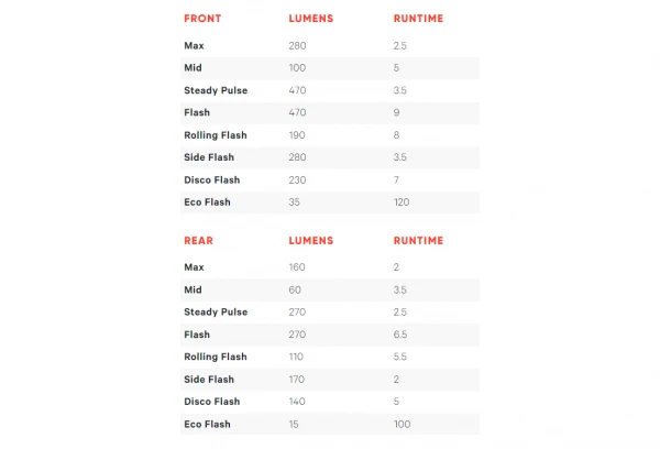 - Puissance lumineuse max : 470 lumens (avant) / 270 lumens (arrière)