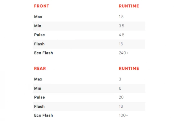 - Puissance lumineuse max : 250 lumens (avant) / 10 lumens (arrière)